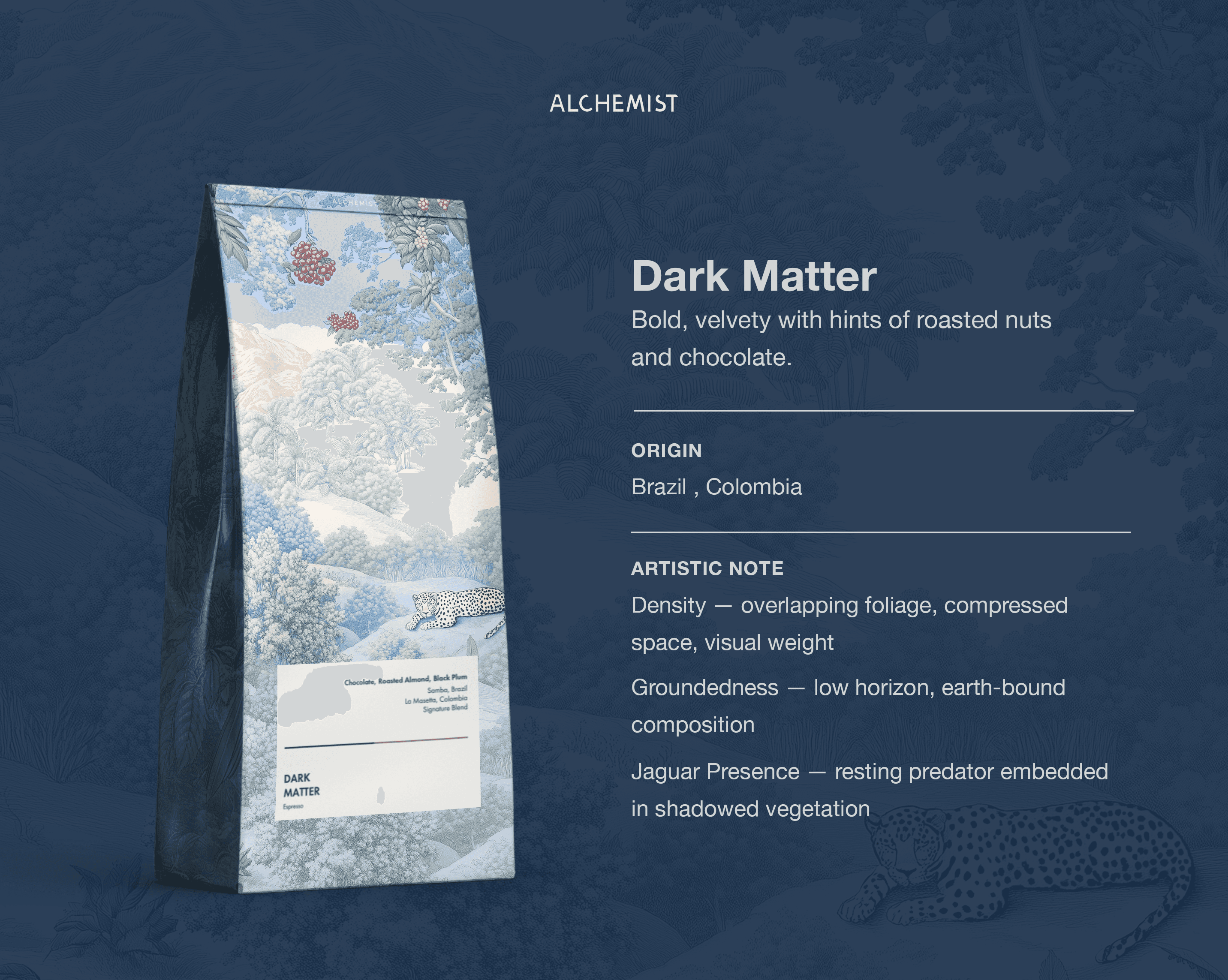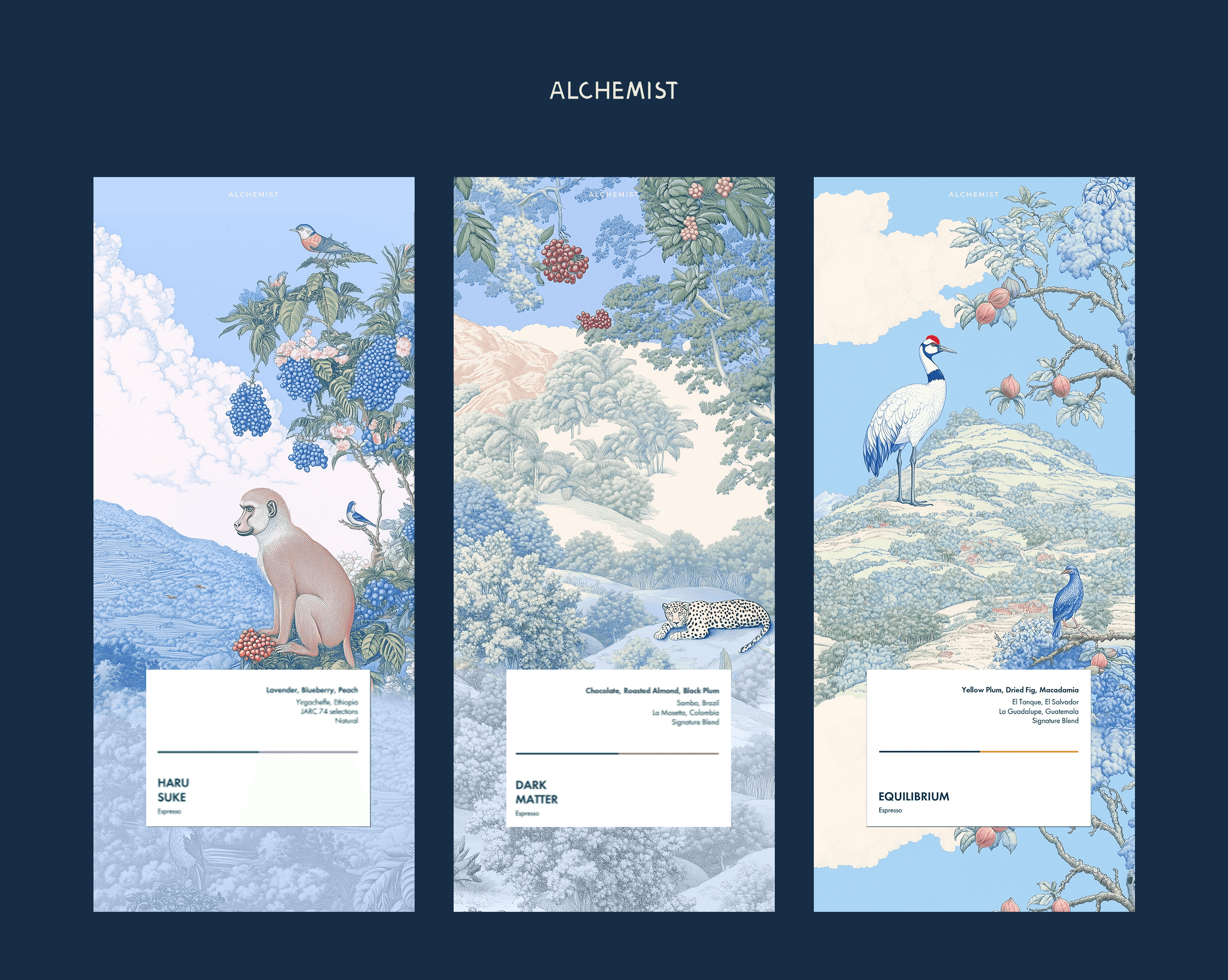 Rather than illustrating flavor notes directly, the works translate each blend into landscape, vegetation, animal presence, and atmosphere, allowing the two origins to merge visually without hierarchy.